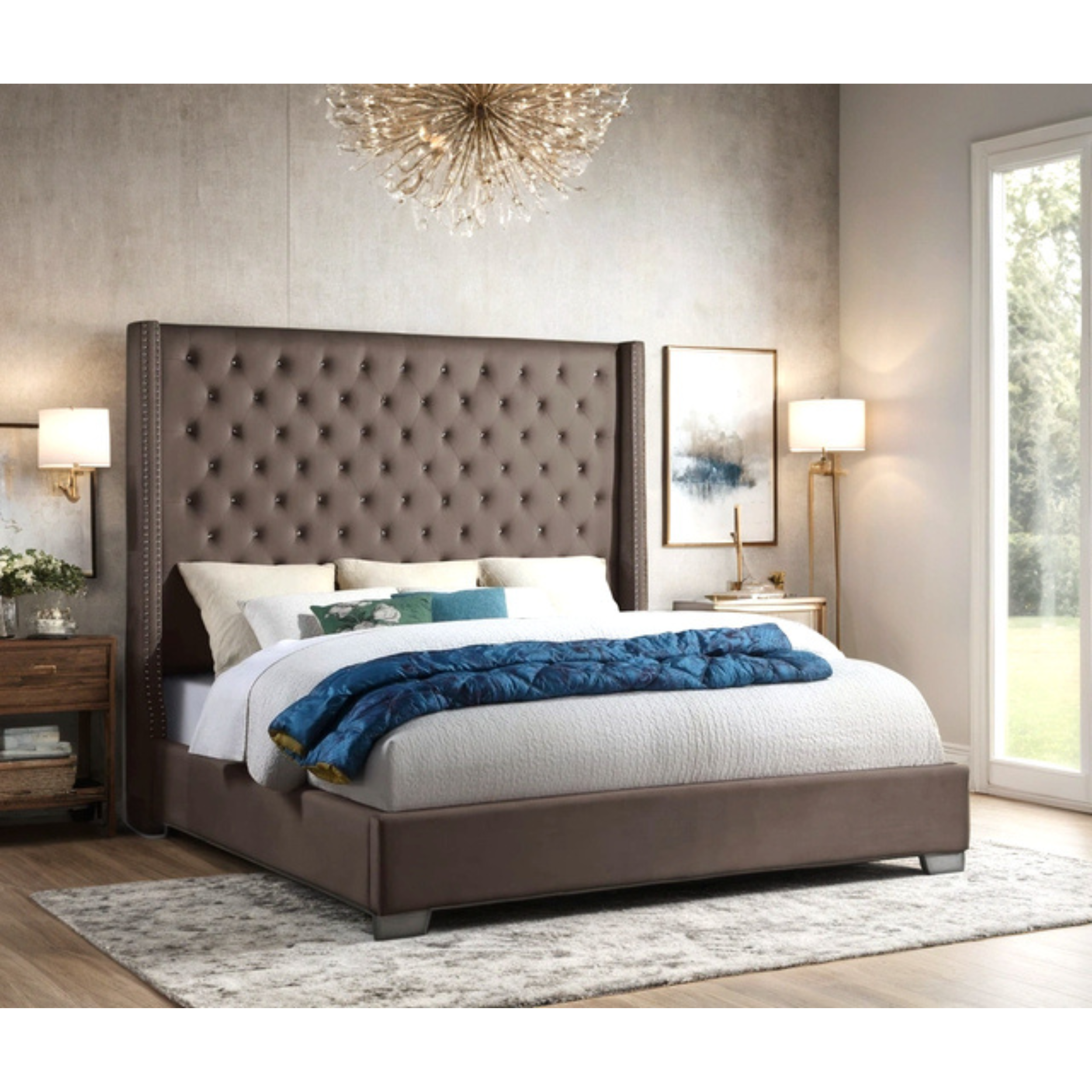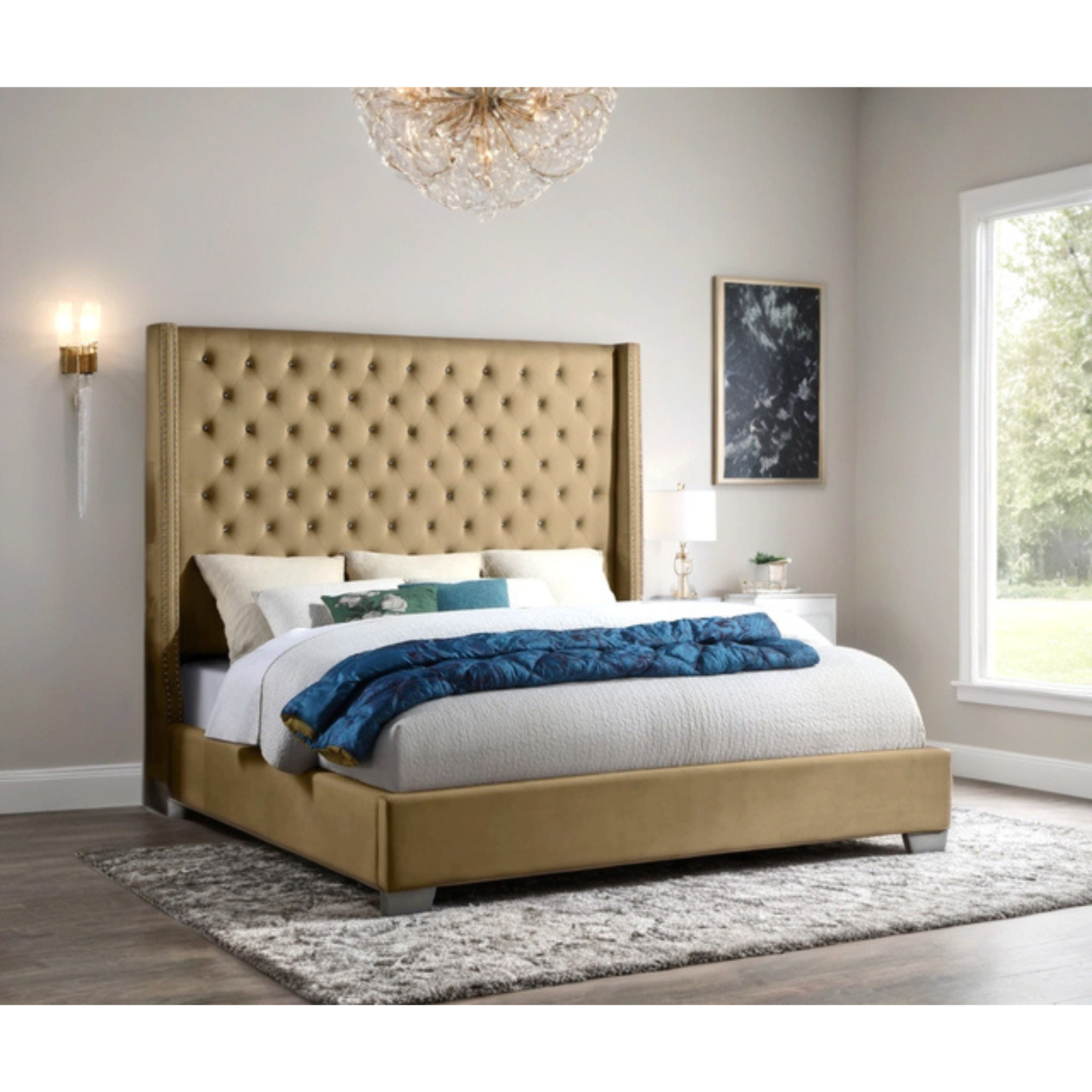 The HH810 Bed features a sophisticated design highlighted by luxurious velvet upholstery and striking gold accents. Crafted for both style and comfort, its plush fabric invites...