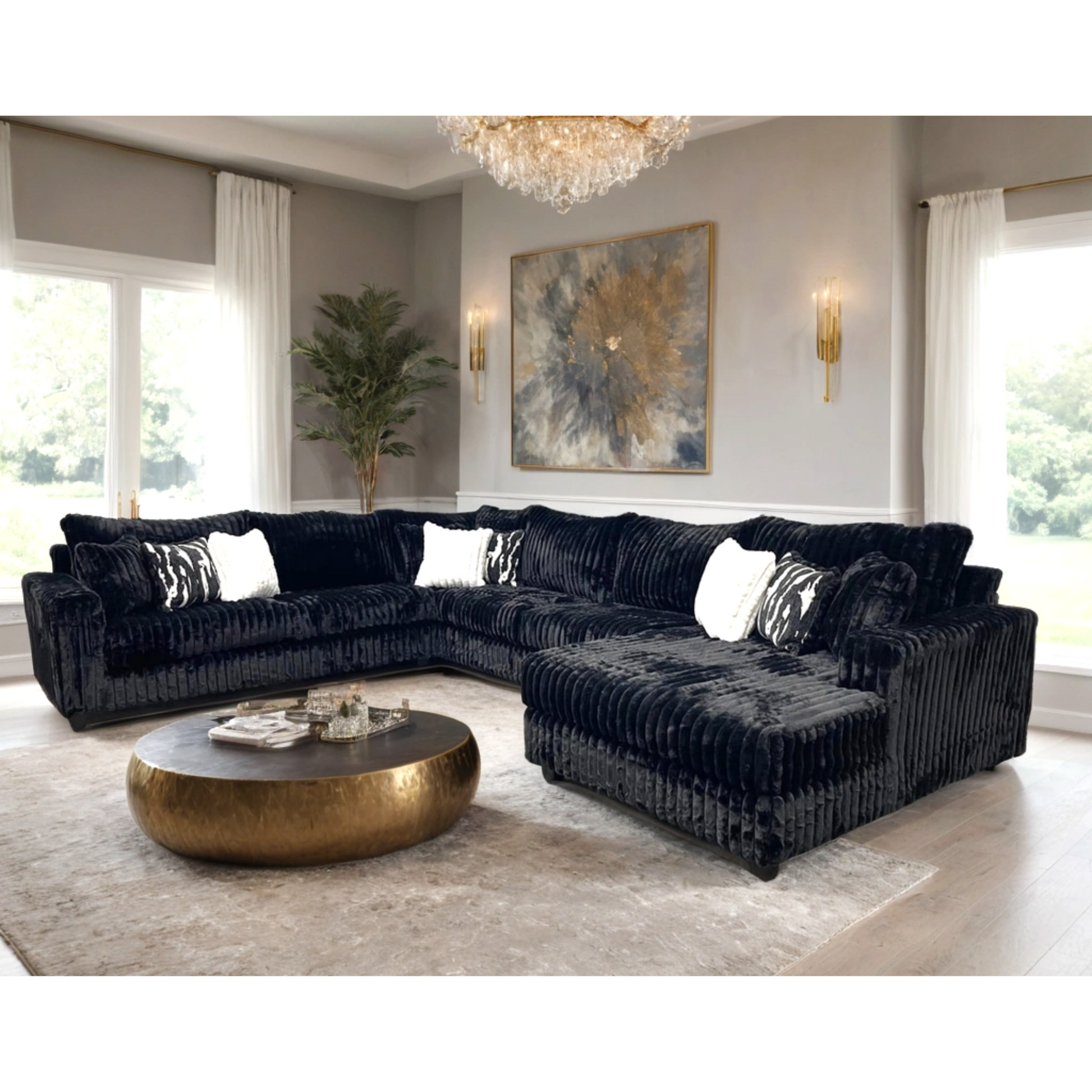 The 9900 XL Sectional features thick seat cushions and an ultra-plush back, delivering exceptional comfort and support. Included with the sectional are nine pillows, enhancing both relaxation and style. This design ensures a luxurious seating experience ideal for extended lounging and adds a sophisticated touch to any living space.
