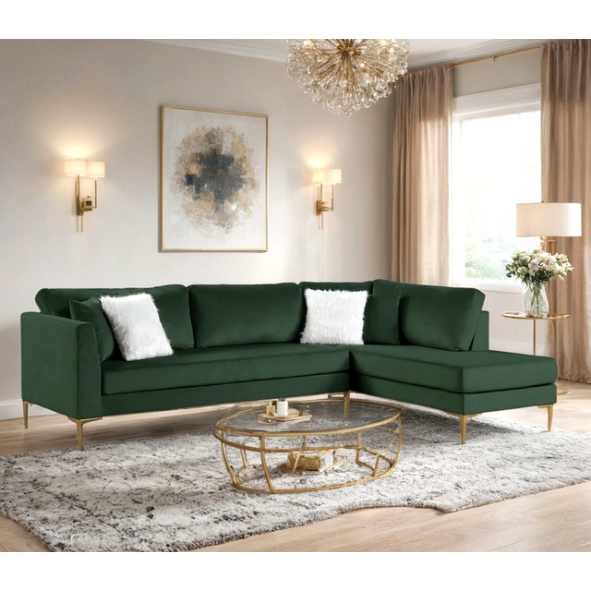 The Catalina Sectional combines luxurious velvet upholstery with sleek gold legs to create a sophisticated modern centerpiece for your living space. Its plush cushions offer lasting comfort, while the gold-tone metal legs add an elegant, contemporary edge. Perfect for both stylish entertaining and relaxing, this sectional enhances any room with refined texture and a polished finish.