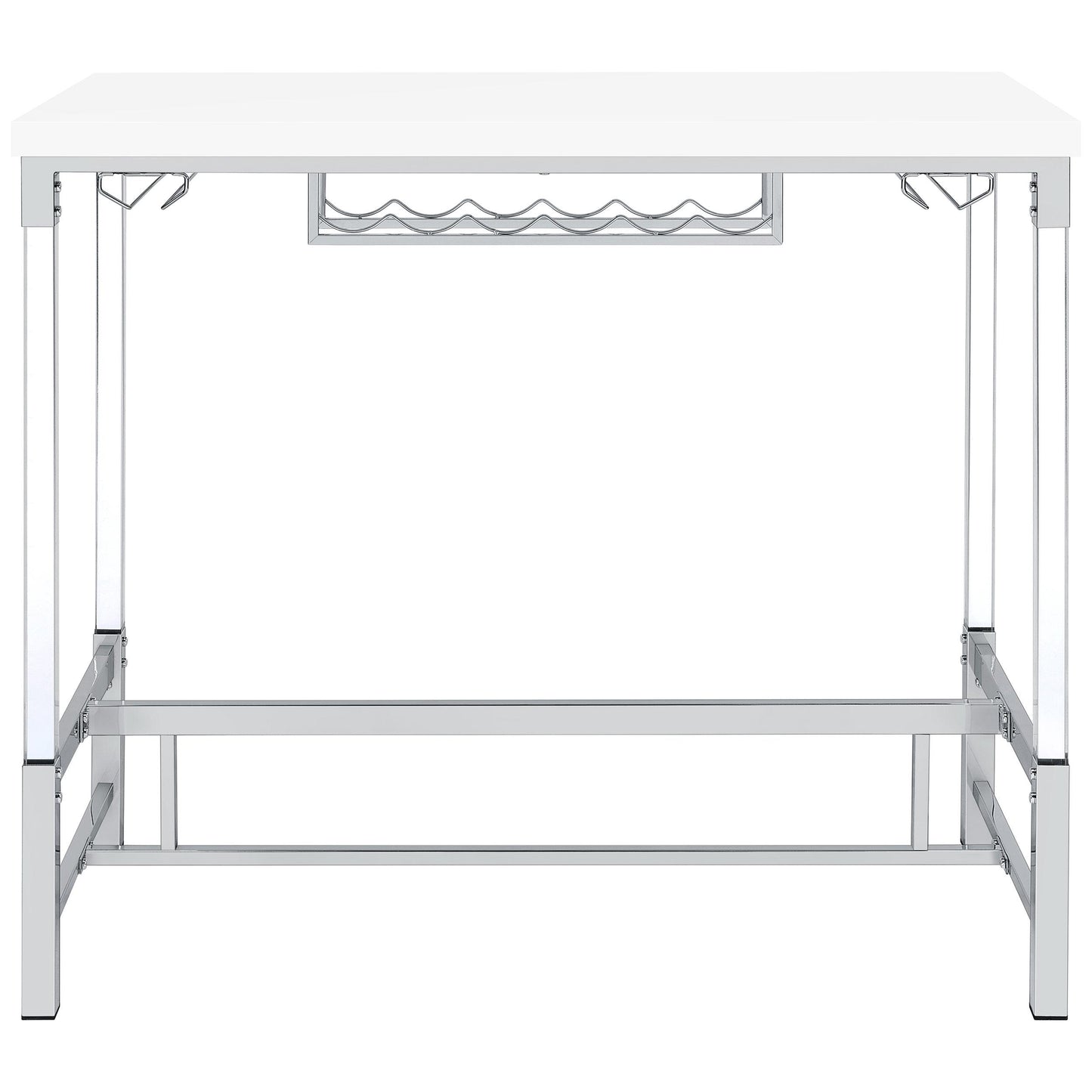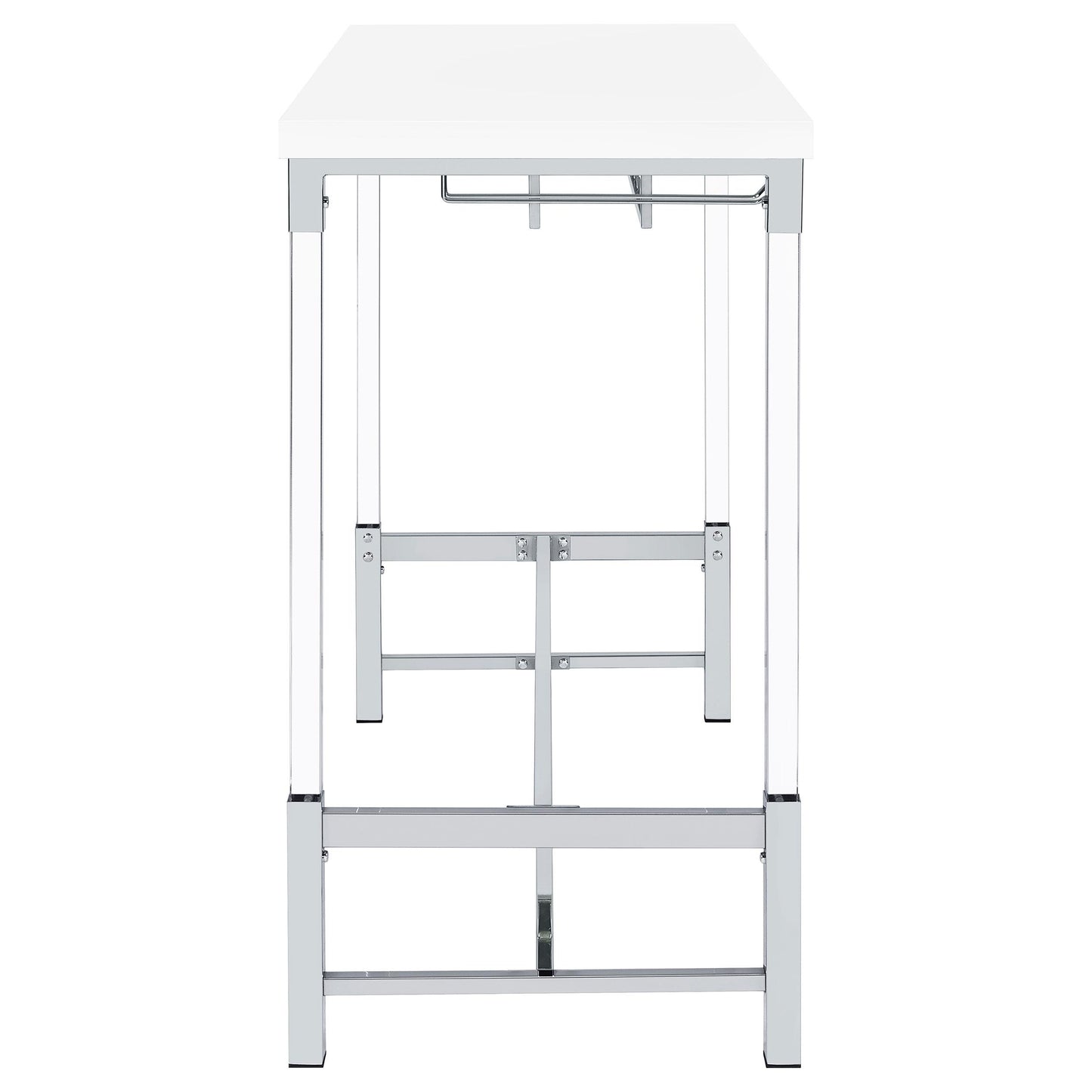• A chic bar table offers ample storage and stylish appeal with acrylic legs