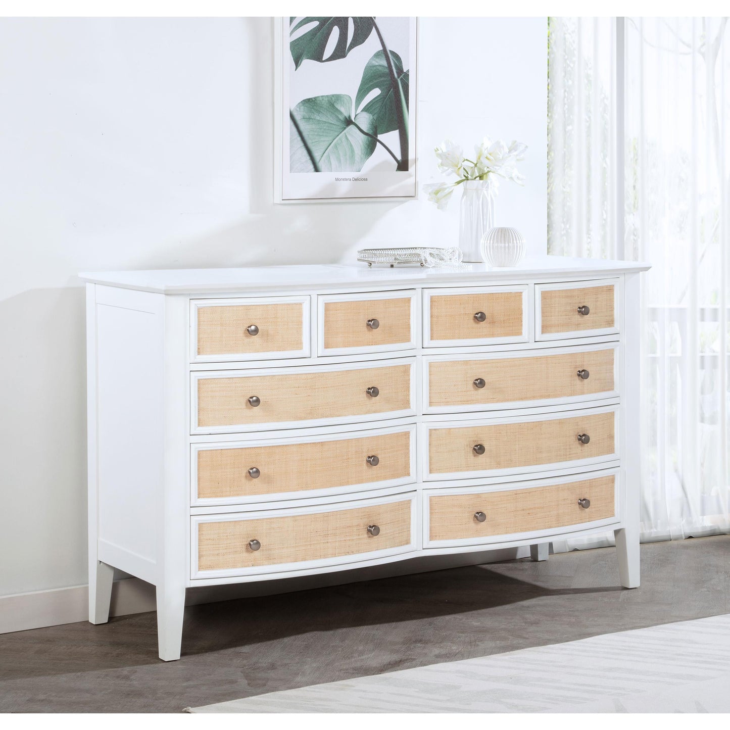 • A double convex front and natural rattan drawer fronts create a charming, textured look and feel