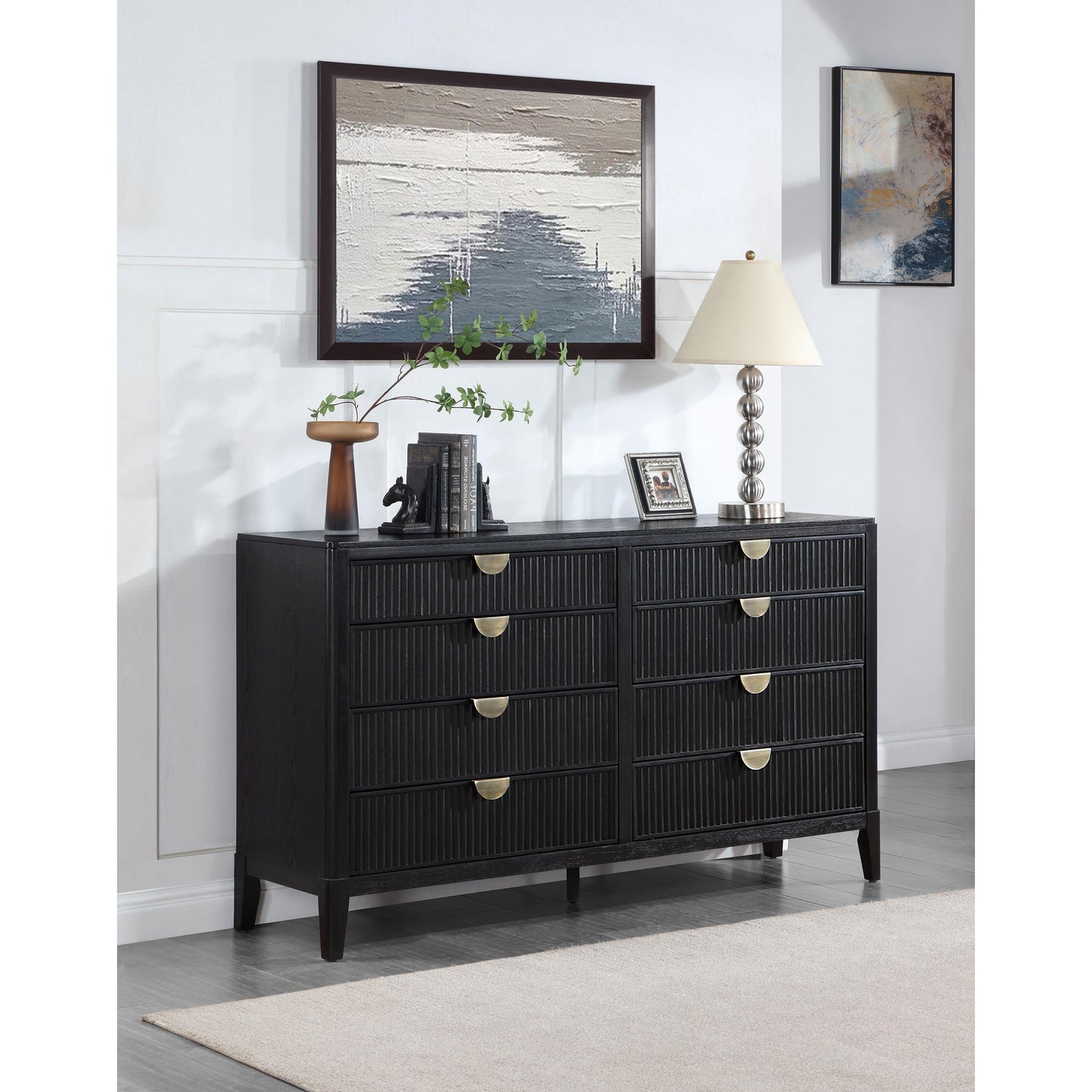 Create a single place to organize clothing and accessories with a stylish, modern eight-drawer dresser. Its timeless stance is augmented with a black finish complete with wire brushing that creates subtle texture and dimensionality. Drawer fronts offer fluted texturing, creating a sense of depth and movement. Half-moon drawer pulls complete the look with a soft golden metallic finish that gleams in the light and adds impeccable warmth. Top drawers include felt lining to protect your delicates, while lower drawers are larger, perfect for everything from sweaters to linens.