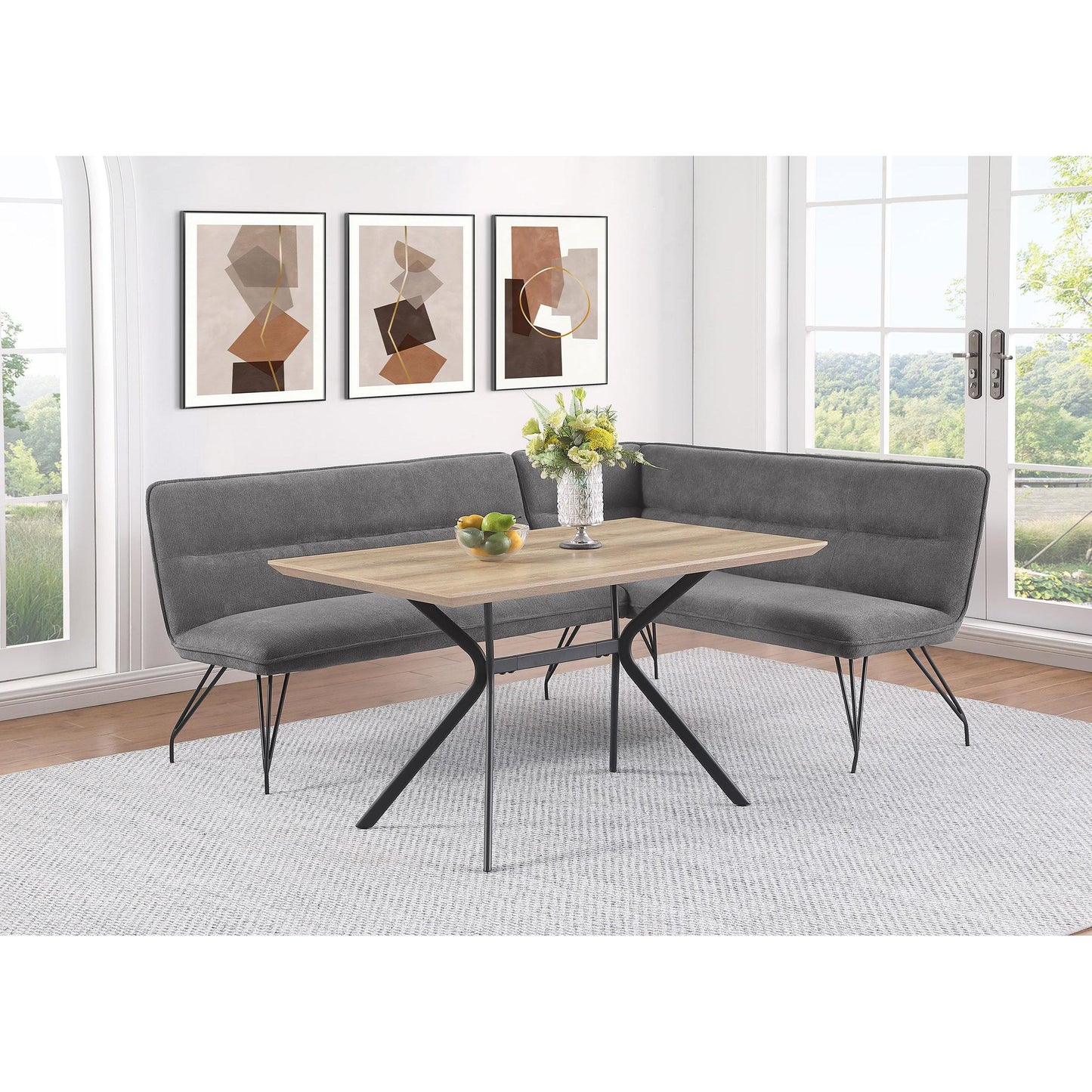 • Create a nook and offer comfortable seating with a modern L-shaped dining bench with retro flair