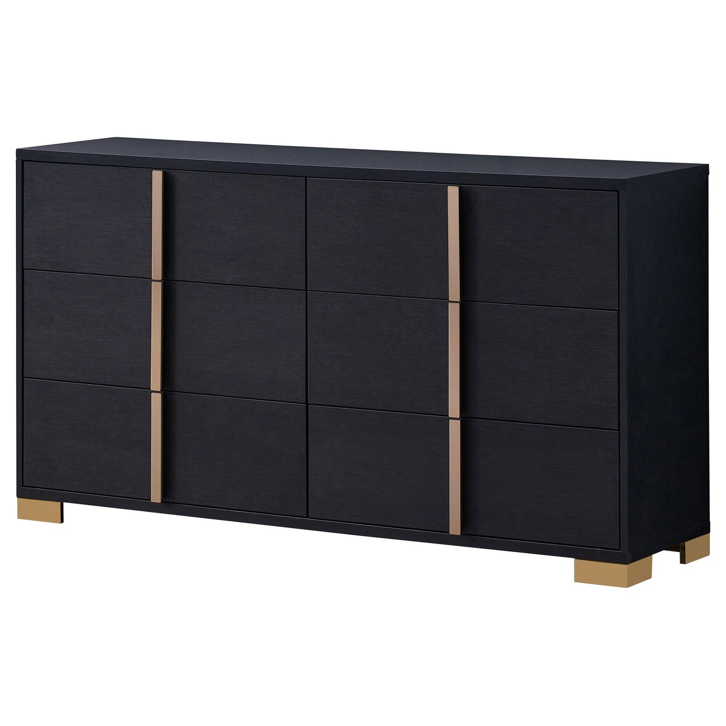 β’ Sleek and simple six-drawer dresser with dramatic aesthetic to change tone of contemporary bedroom