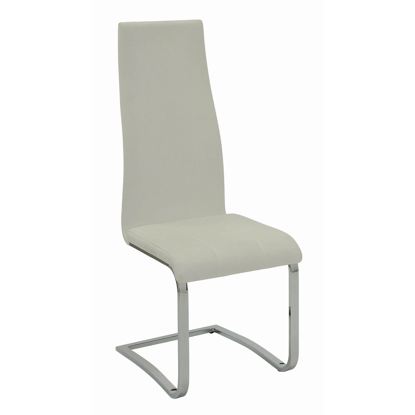 • Contemporary dining group with unique chrome finish bases in the foot of the table and chairs