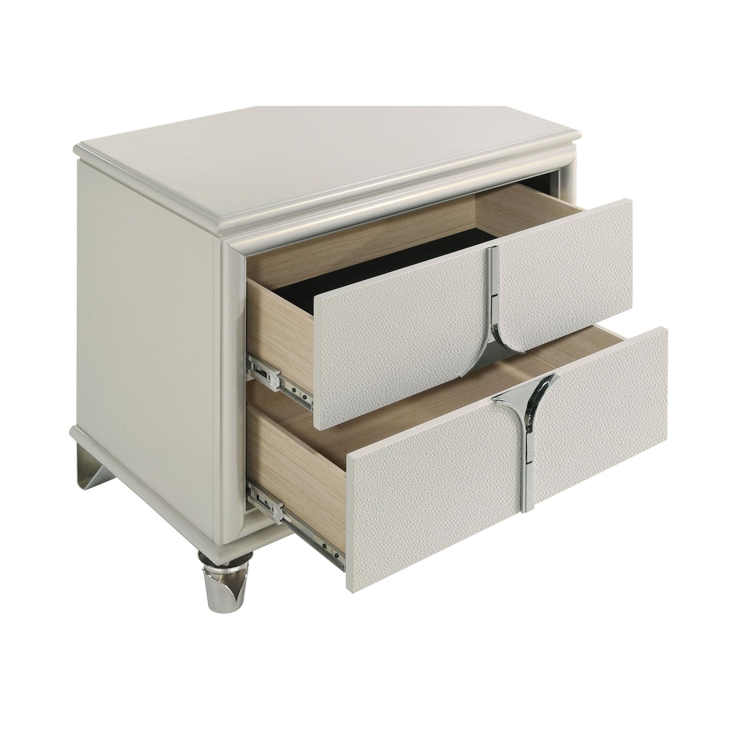 Elevate your nighttime routine with this stylish 2-drawer nightstand, a perfect blend of form and function. The pearl white finish and diamond star design on the drawer front offer a touch of glamour, while the chrome metal pulls add a sleek contrast. Featuring a top drawer with cord management access, this nightstand is designed to keep your devices neatly organized. The acrylic legs and chrome tulip-shaped caps provide a unique and elegant touch. Experience convenience and style right by your bedside.