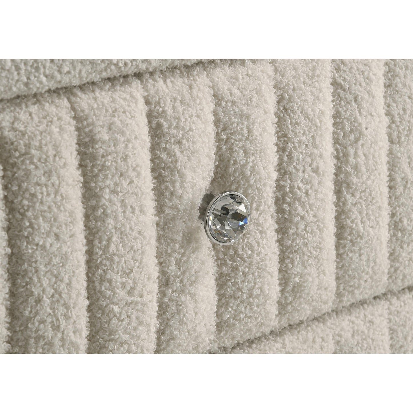 Add a touch of elegance and functionality to your bedroom with this stunning oval nightstand. The plush bouclé upholstery, adorned with sparkling acrylic button tufts, offers both a luxurious feel and eye-catching detail. Two spacious drawers provide ample storage for your essentials, while the clear tempered glass top adds a sleek and modern finish. The acrylic knobs complement the tufted design, bringing a cohesive and polished look to your space. Perfect for keeping your nighttime necessities close at hand, this nightstand effortlessly blends style and convenience.