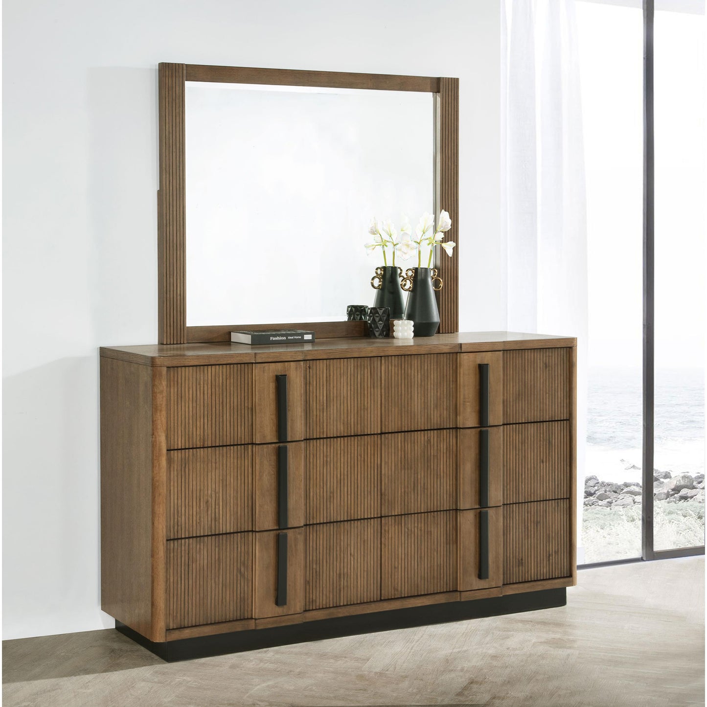 • Six roomy drawers in a modern wooden dresser with a mirror create ample storage for clothing
