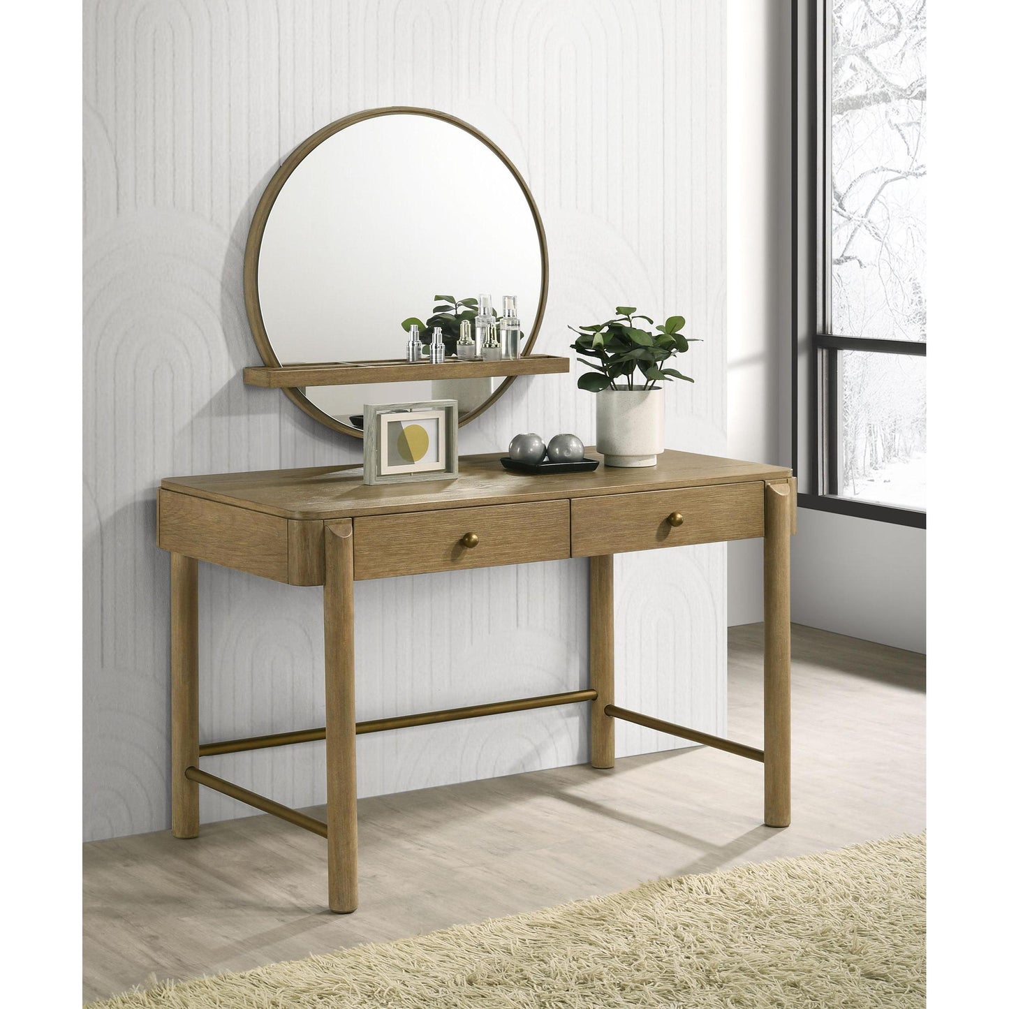 • Two-piece makeup vanity set includes a vanity table and a round wall-hanging vanity mirror