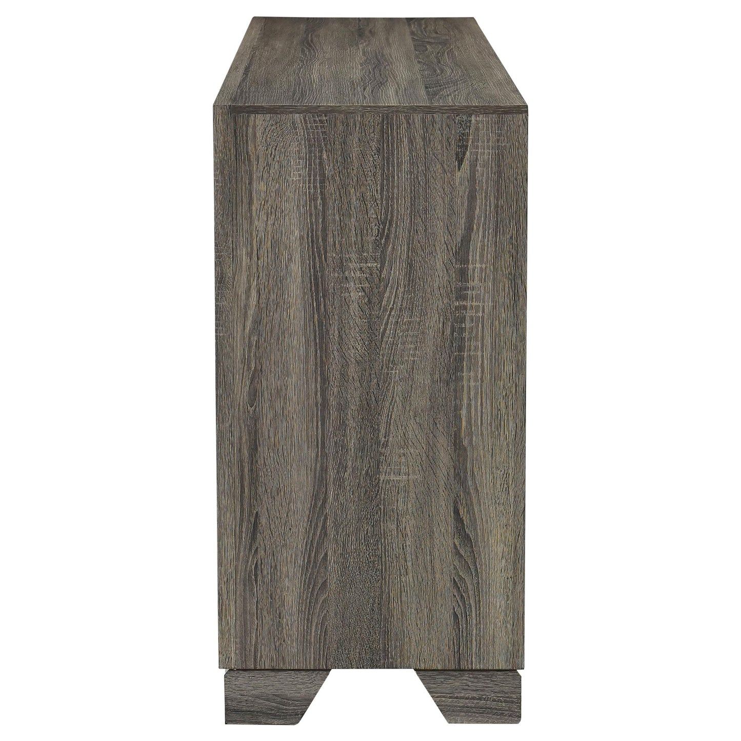 • A brown oak wood grain finish is complemented with metal bar handles that add a touch of contrast