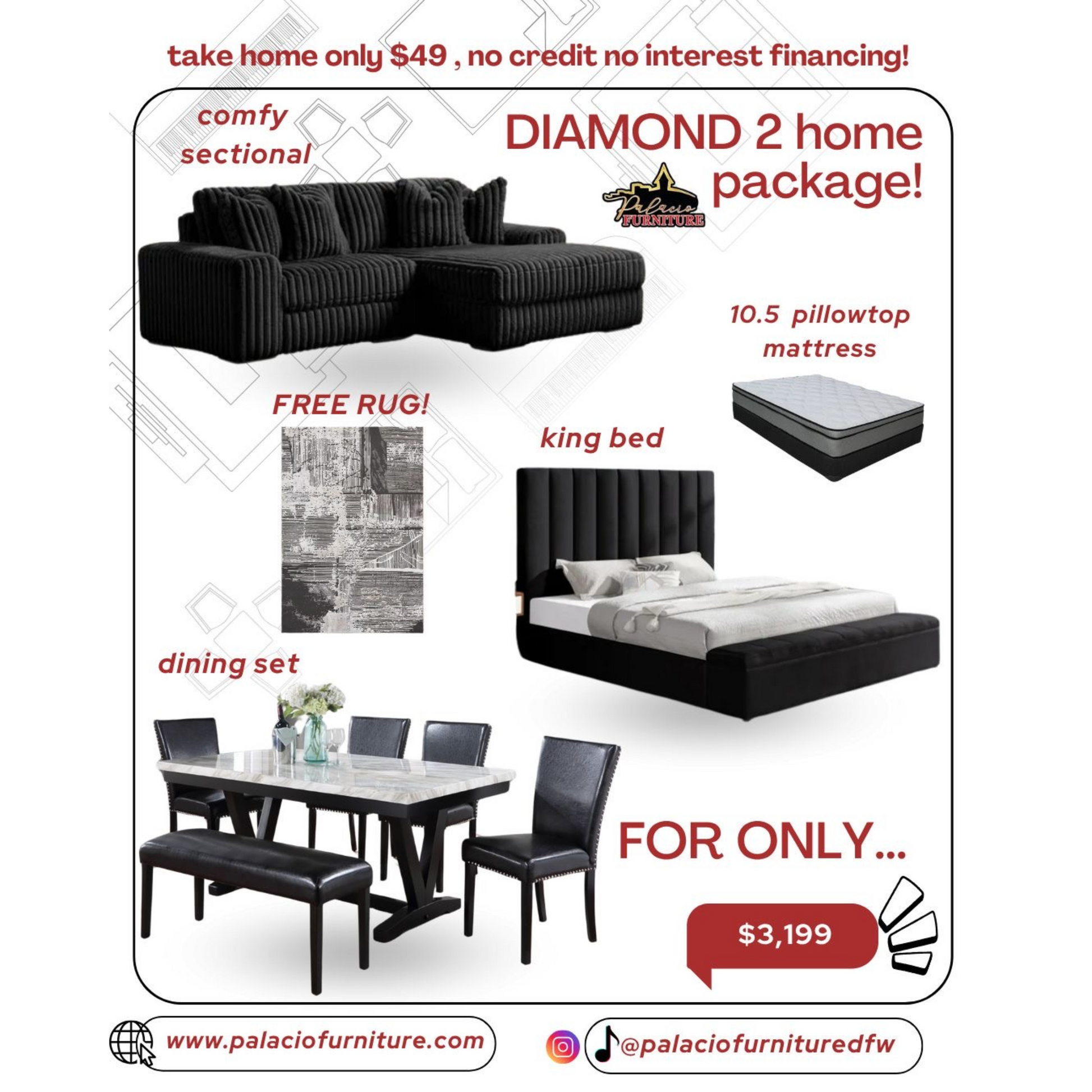 Transform your living space with the Elegant 2 Home Package, featuring a sophisticated Black color palette. This set includes a bed with a high headboard and built-in storage for practical organization ans a pillow top mattress. Enjoy a marble table paired with four stylish chairs, perfect for dining or gatherings. Relax on the comfortable, tender corduroy couch designed for lasting comfort. Plus, receive a complimentary rug to complete the look and add warmth to your home. This package combines functionality and elegance for a cohesive, expert-curated interior.