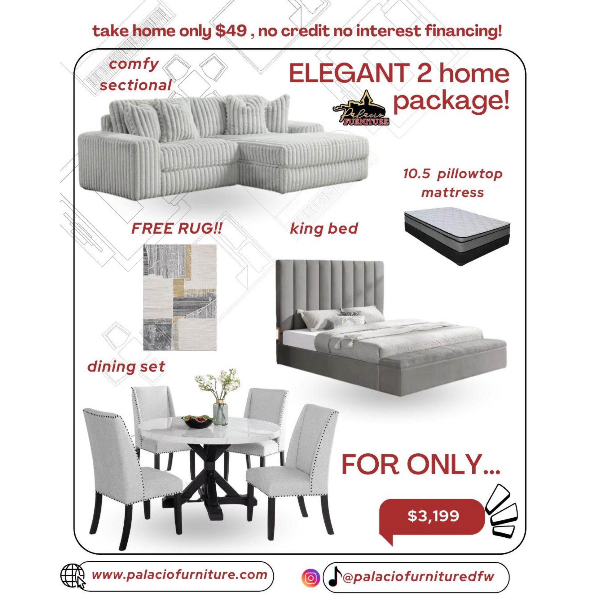 Transform your living space with the Elegant 2 Home Package, featuring a sophisticated grey color palette. This set includes a bed with a high headboard and built-in storage for practical organization ans a pillow top mattress. Enjoy a genuine marble table paired with four stylish chairs, perfect for dining or gatherings. Relax on the comfortable, tender corduroy couch designed for lasting comfort. Plus, receive a complimentary rug to complete the look and add warmth to your home. This package combines functionality and elegance for a cohesive, expert-curated interior.