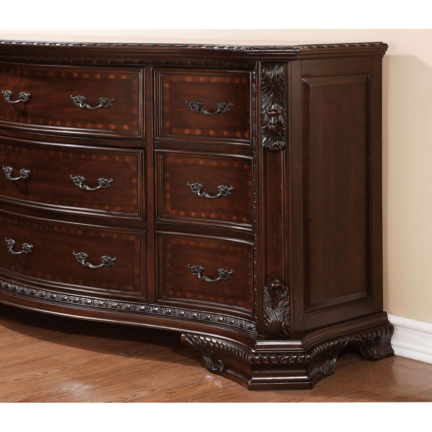 The brown cherry finish and antique brass handles complement one another, creating an overall harmonious feel. Elegant floral accents and bracket feet on this dresser can visually enhance any bedroom setting.