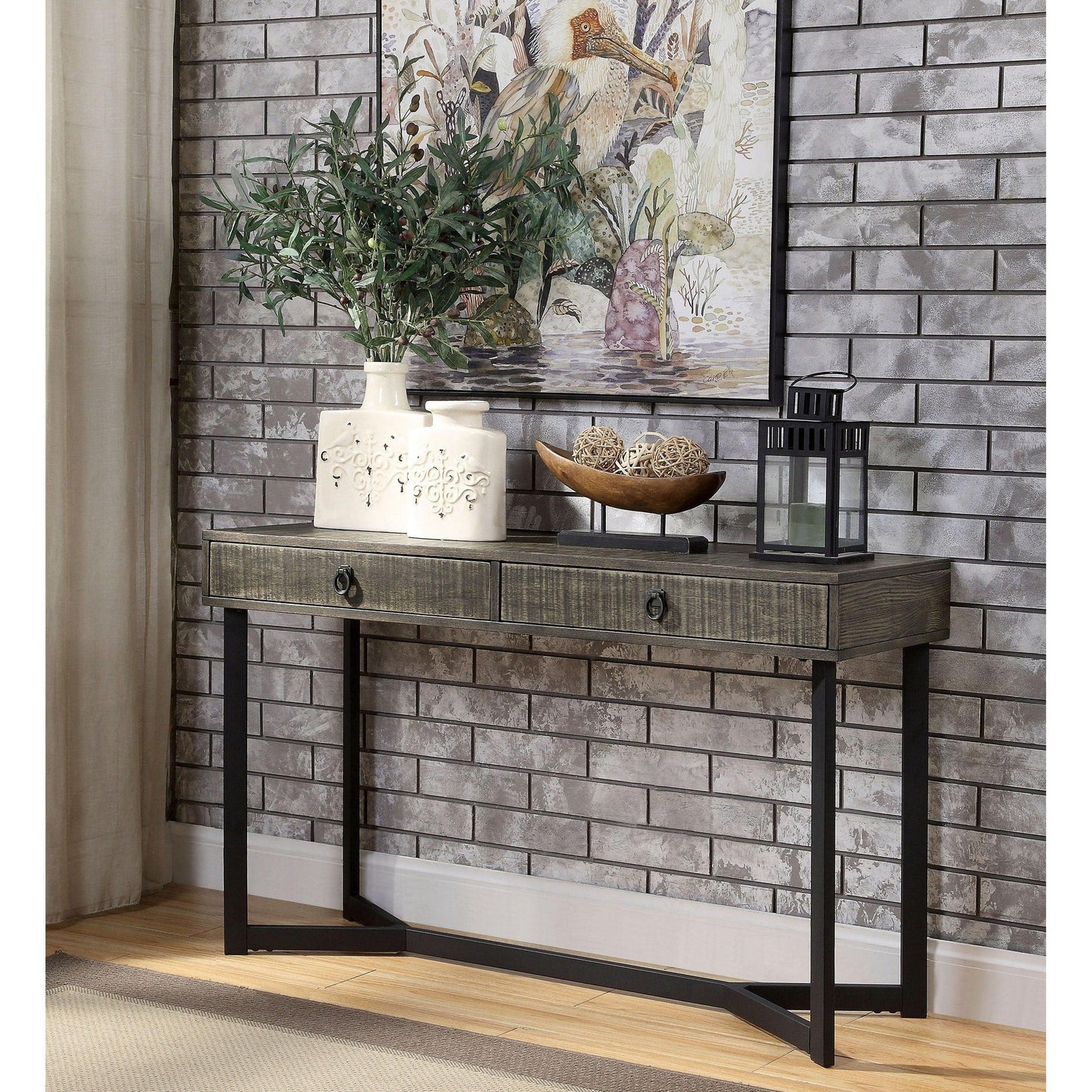 This industrial sofa table is the perfect centerpiece for any space. The dark oak table top features a wire-brushed finish, giving this piece eye-catching texture. With storage drawers, a sturdy metal base, and a solid-wood top, this sofa table is not only beautiful but durable.