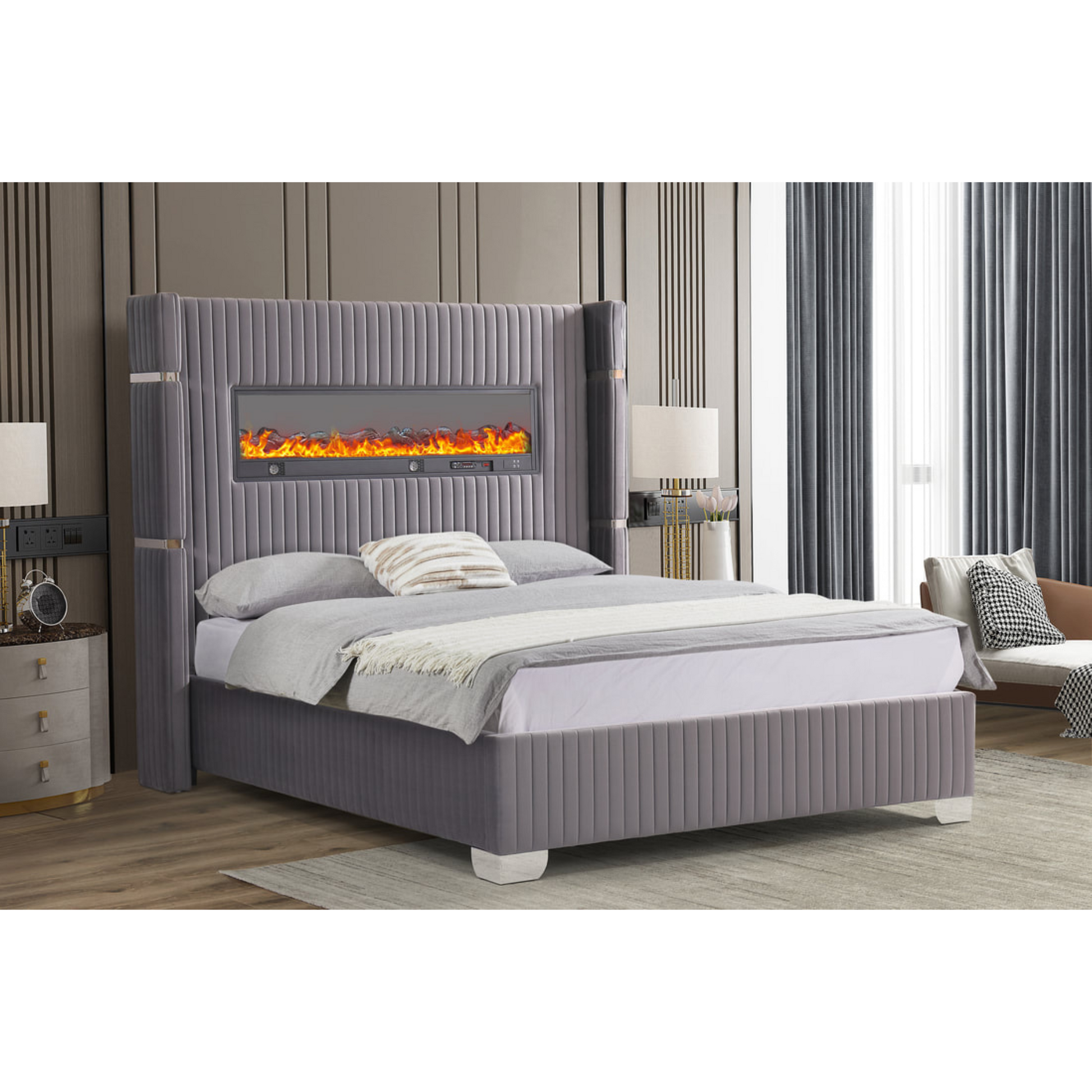 The Romance Bed combines modern technology with elegant design, featuring a multi-color fireplace display integrated into the headboard that creates a warm, inviting ambiance. Built-in Bluetooth speakers offer high-quality sound, allowing you to enjoy your favorite music or podcasts seamlessly. This platform bed provides sturdy support and a sleek profile, making it a sophisticated centerpiece for any bedroom. Ideal for those seeking both comfort and innovative features in one stylish package.