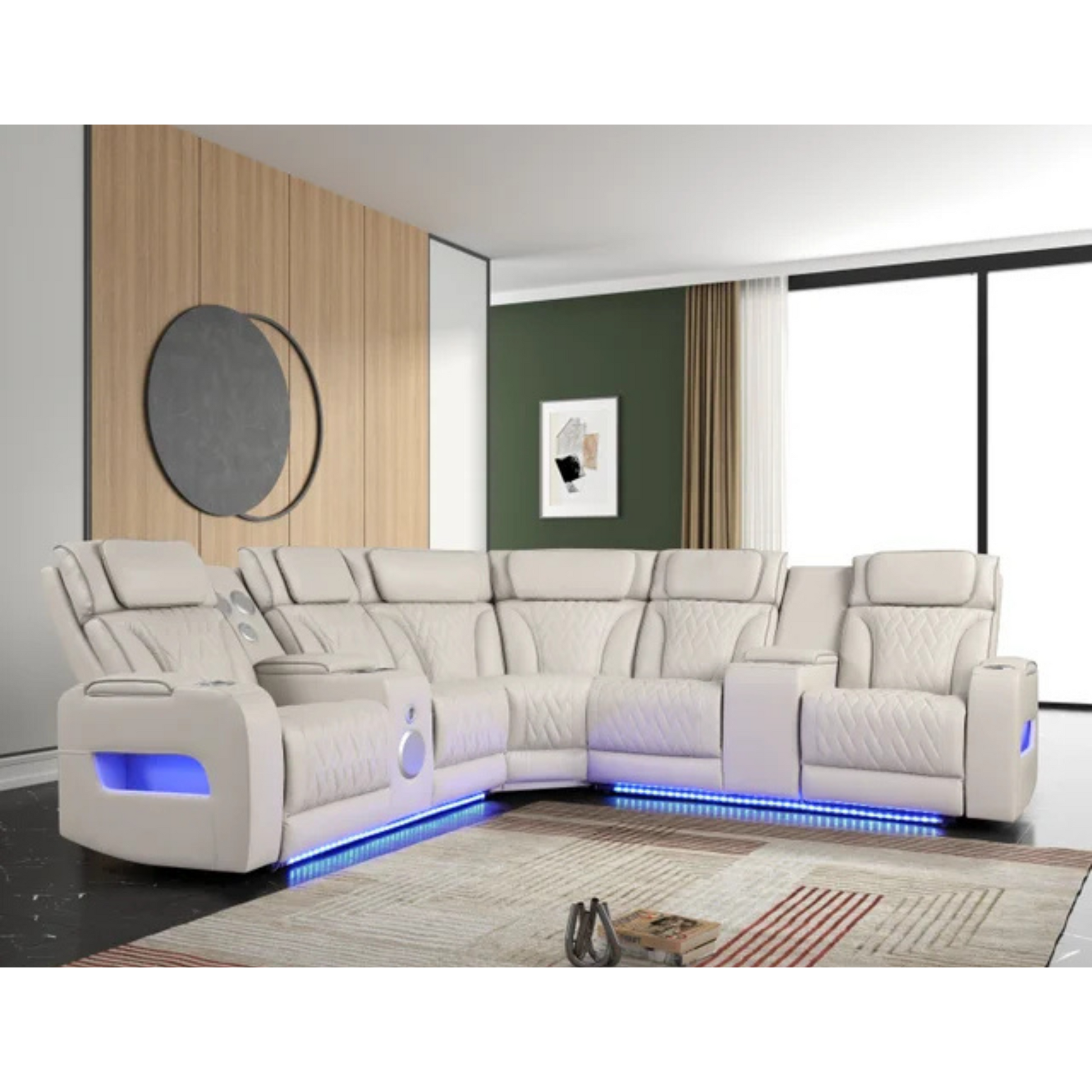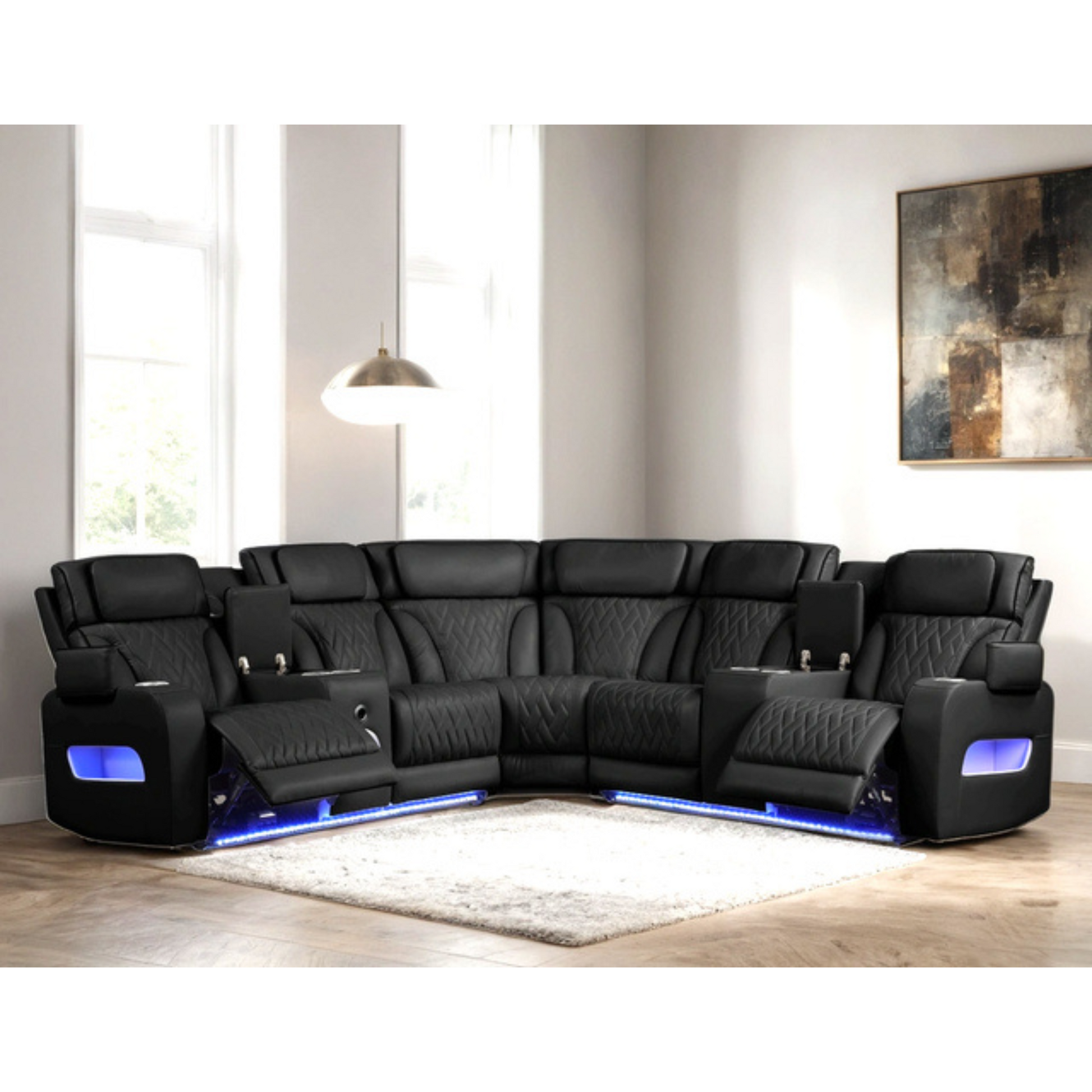 The Spain Sectional offers advanced comfort with two power footrests and headrests, positioned on both the left and right sides for personalized relaxation. Integrated LED light strips enhance ambiance, while built-in Bluetooth speakers provide immersive audio, making this sectional a sophisticated centerpiece for any living space.